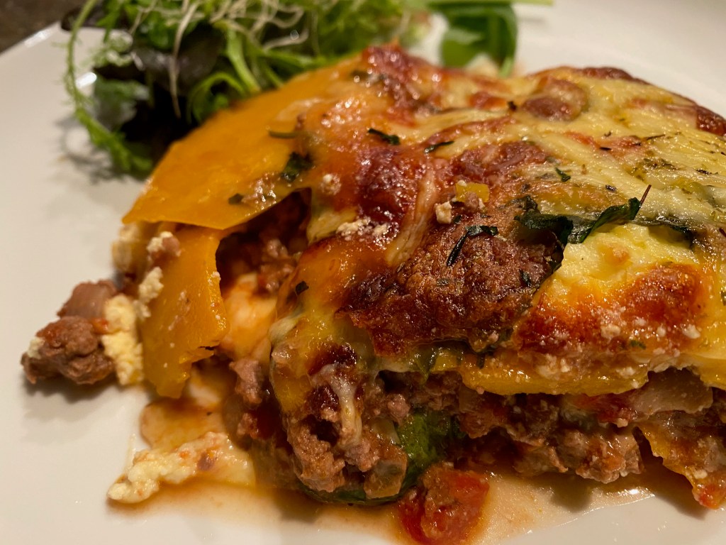 Now there’s a million versions of lasagna & my take on it is perhaps not very traditional to the good old Italian Mamma version, as I don’t like cheese (unless it’s been melted, weird I know). I don’t make a cheese sauce (I hear a gasp of horror from some) but I use ricotta & mozzarella instead as they are less strong cheesy flavours. I also use slices of pumpkin instead of gluten free pasta which works very well!