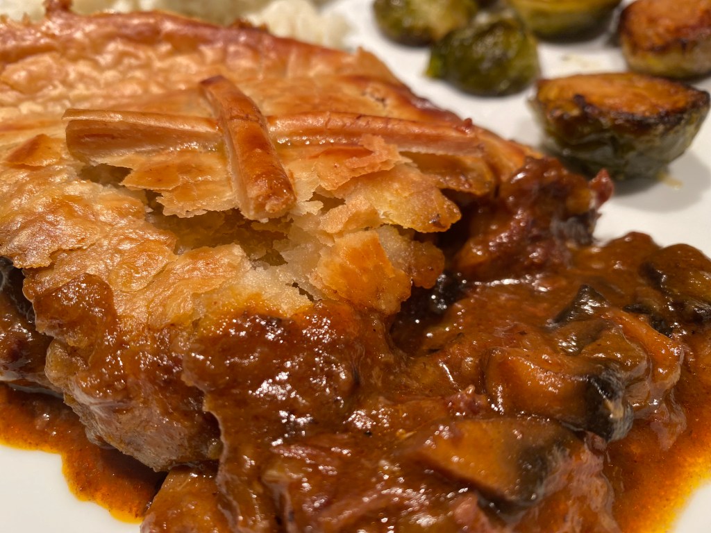 Pastry – I cheated & found this flaky puff pastry simply delicious! Let it thaw before use, but don’t let it dry out. When you’re happy with the filling consistency, pour into a deep ceramic pie dish & cover with the pastry. Brush with a beaten egg (mixed with a splash of water) & pop back into the oven for around 25 mins until the pastry is a golden brown.